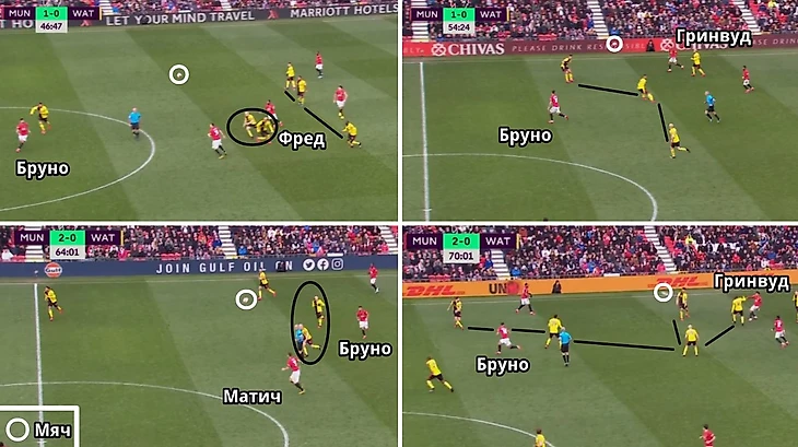 Уотфорд играл крайне гибко и разнообразно для команды, которая находится на предпоследней строчке в таблице, правда с созданием моментов у Шершней явные проблемы. Гости логично использовали на чужой половине поля 4-4-2 для прессинга четырех защитников и двух опорников. Получалось эффектно и эффективно, за первые 15 минут набралось огромное количество потерь у игроков Манчестер Юнайтед.