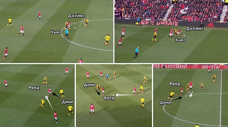 За спину прессингующим манкунианцы начали забрасывать мяч верхом, Марсиаль и Джеймс отодвигали подальше защитников Шершней, а так как в опорной теперь зияла огромная брешь, контратаки проходили на ура.