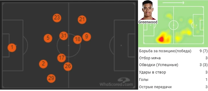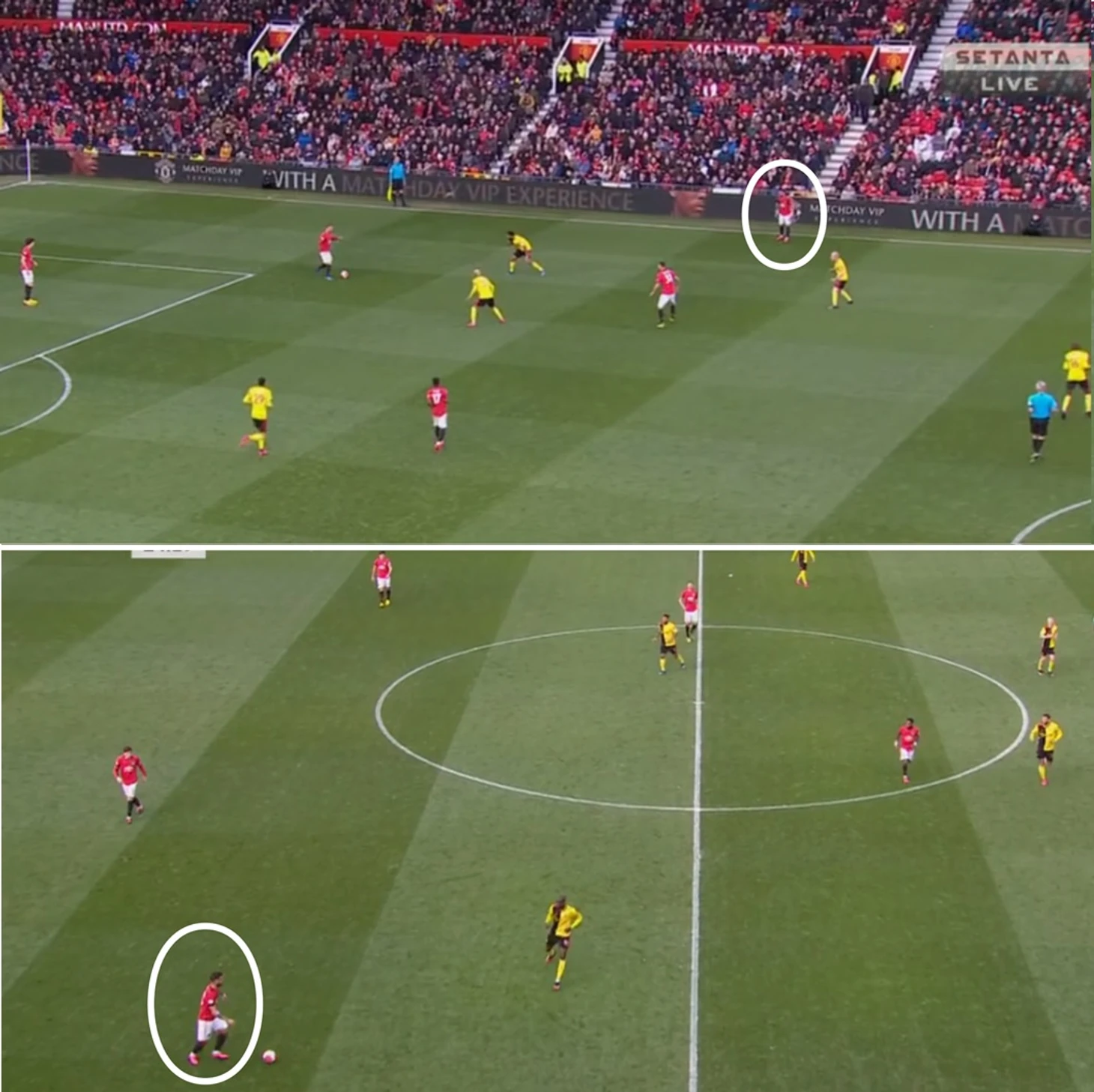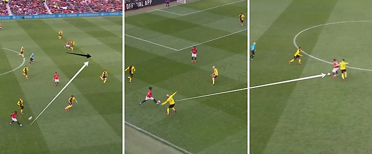 Помимо этого, пару раз использовались переводы с фланга на фланг и быстрый выход в атаку. Организовывали его Аарон и Антони, вот уж где диву даешься, когда вспоминаются первые матчи Уан-Биссаки и Марсиаля в новых ролях: