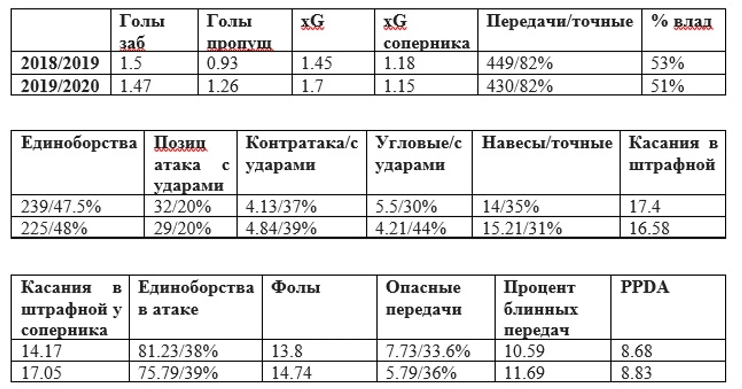 Если сравнивать цифры Локо сезонов 2018/2019 и 2019/2020 данные в принципе похожи, 2019/2020 чуть хуже. Опасные передачи 7.73 и 5.79, фолы 13.8 и 14.74. Команда существенно в этом году недобирают забитых мячей 1.47 при xG 1.70, хромает реализация. У Смолова 0.28 при 0.58 xG. Вполне логично Смолова зимой отпустили в Сельту. В командную игру он так и не вписался. Такая же ситуация и в обороне, пропускают больше, чем должны. О наличие вратарской проблемы мы уже говорили. По xPTS Локо второй в лиге с 32 очками.
