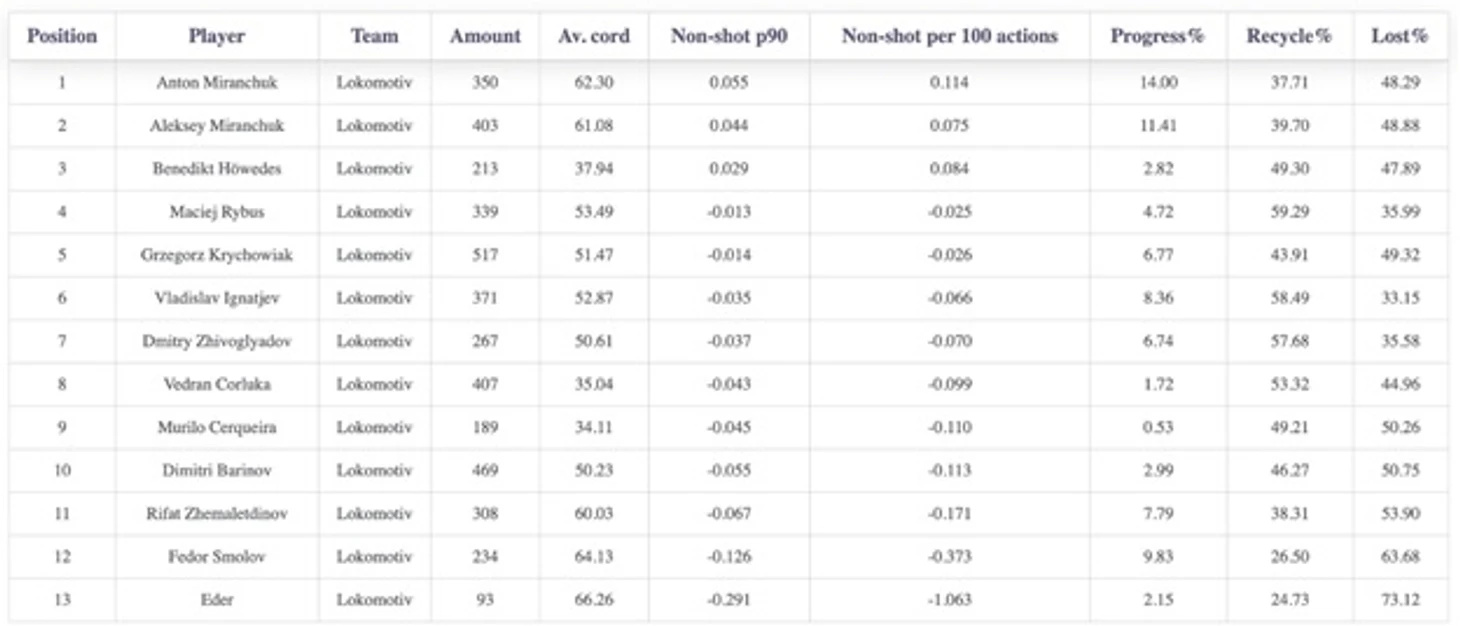 Братья Миранчуки играют безусловно ключевую роль в нынешнем Локомотиве. Ниже таблица из паблика Никиты Васюхина Блокнот по Non-shot xG. Из таблицы видно, что вся острота в игре Локо исходит именно от Миранчуков. Положительный Non-Shot в таблице свидетельствует, что игрок своими передачами и «ранами» лучше остальных продвигают мяч в позиции с высоким шансом забить в атаке. Соответственно, если нон-шот отрицательный, то игрок своими действиями на мяче чаще отдает владения сопернику в хороших для него зонах (на своей половине, например), чем доставляет его в благоприятные зоны для своей атаки.