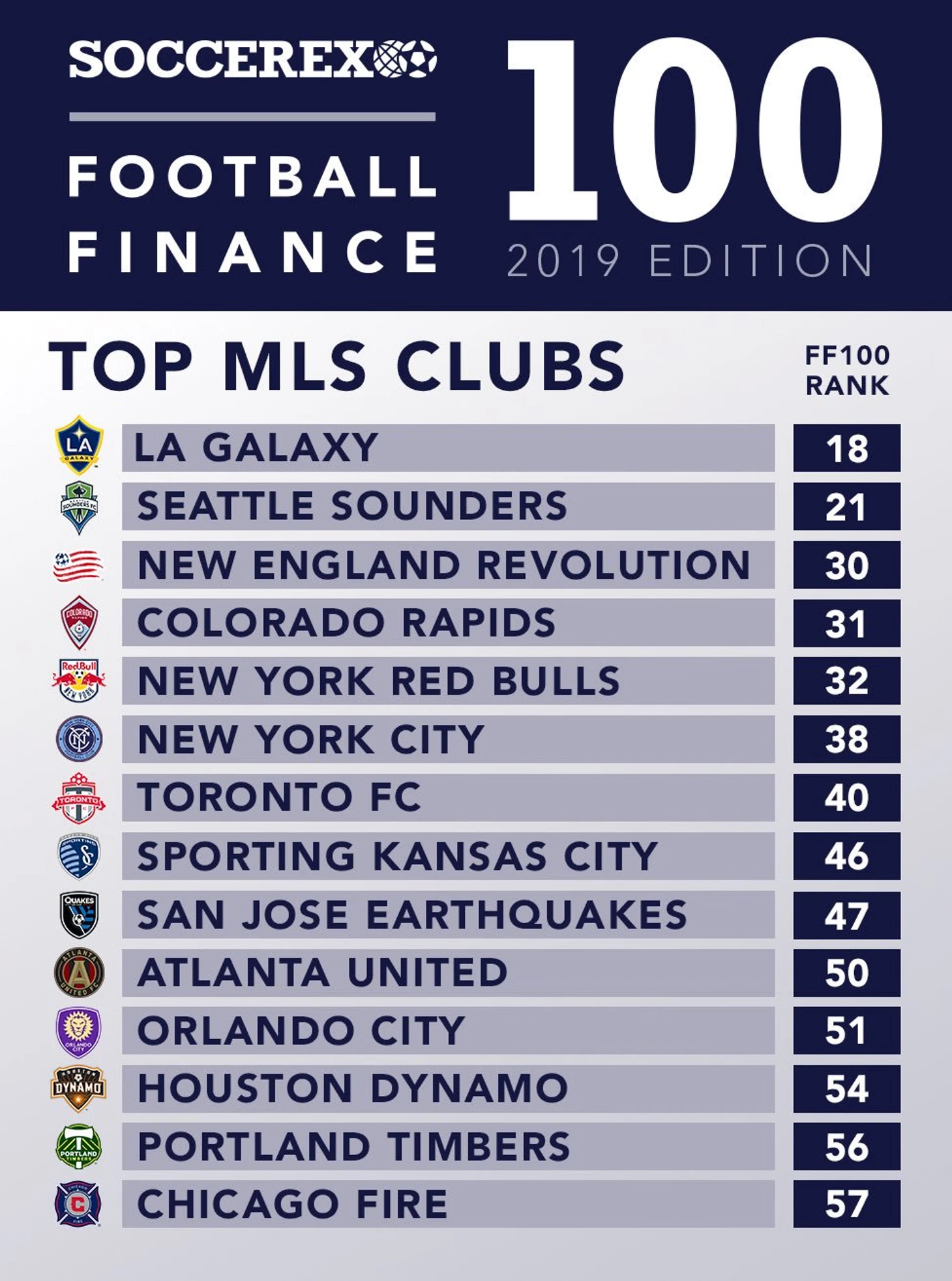 В сотню лучших вошли сразу 17 клубов МЛС. Таким образом лига стала второй по количеству самых успешных и финансово стабильных клубов мира, уступив только английскому чемпионату, где набралось 23 клуба, правда из Премьер Лиги и Чемпионшипа.