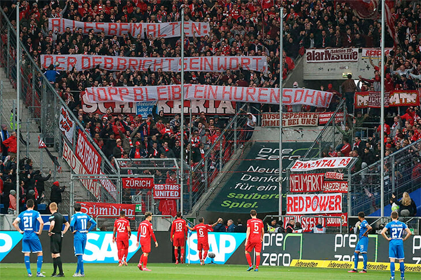 Во время гостевого матча с «Хоффенхаймом» фанаты «Баварии» разукрасили сектор огнями файеров и развернули баннер с оскорблением владельца «Хоффенхайма»: «Дитмар Хопп все еще сын шлюхи».