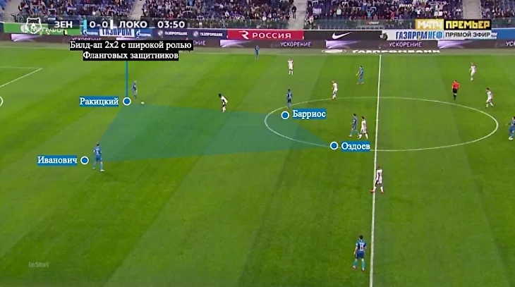 Запомнившийся обрез Ракицкого, который только из-за нерасторопности Крыховяка не закончился опасной атакой, вряд ли можно назвать случайностью. Равно как и опасный перепас парой центральных защитников через центр поля. Все это стало следствием изменения билдапа команды — если в первой половине сезона розыгрыш мяча в первой фазе атаки осуществлялся через Ивановича, Ракицкого и спускавшегося к ним Барриоса, то в 20-м туре РПЛ Барриос и Оздоев держались явно выше, образуя построение 2-2.