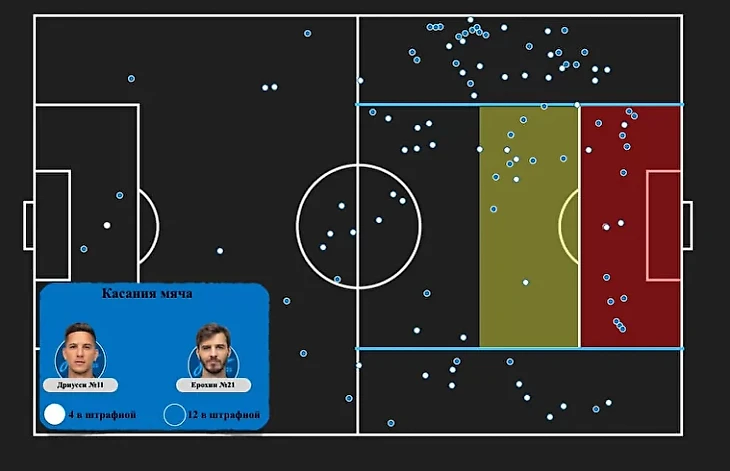 После перерыва ситуация изменилась, Себастьян стал чаще опускаться ниже к мячу, получив более свободную роль. В особенности часто Дриусси стягивался на левый фланг, уже привычный ему по «Зениту», где команда и создавала наибольшее давление. Интересно, что подобного нешаблонного движения команде как раз сильно и не хватало.
