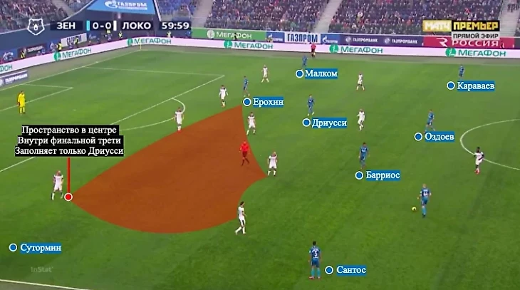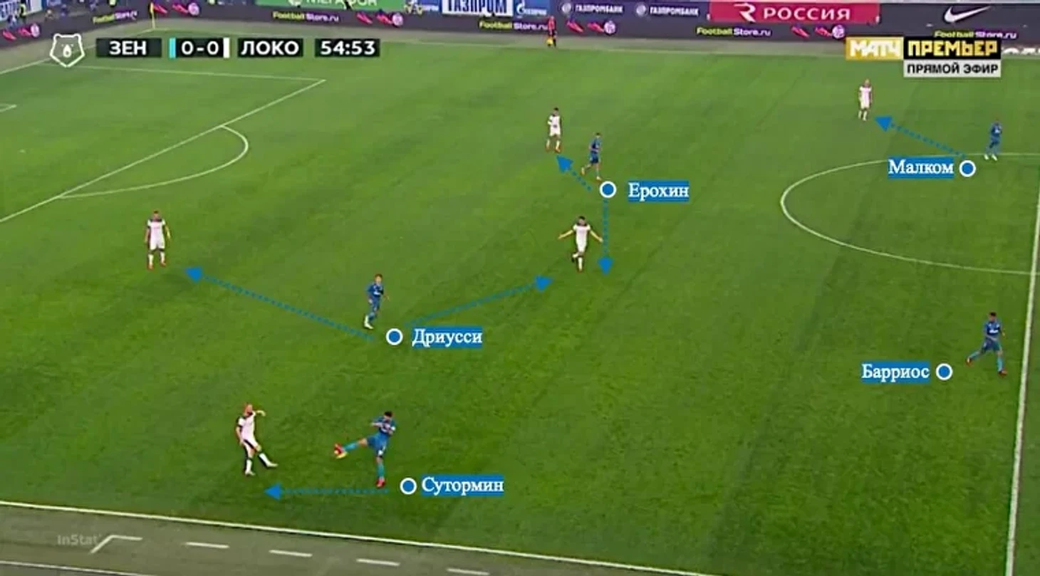 Помимо того, определенное влияние на игру 21-го номера «Зенита» оказала установка помогать в центре поля при выносах мяча от ворот Гильерме. Ерохин спускался к центральной линии между Магкеевым и Крыховяком для игры по выносу. При этом впереди оставался Дриусси с эпизодической поддержкой от Малкома. Для начала быстрой атаки этого было бы достаточно, вот только выигранный верх уходил в борьбу, а линия обороны «Локо» находилась достаточно низко для того, чтобы эту борьбу выигрывать без предоставления дополнительного пространства.