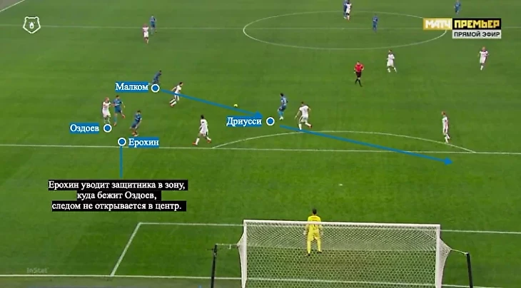 Дриусси разгоняет атаку со своей половины поля, играет с Малкомом и совершает рывок в центр штрафной. Ерохин в то же время уводит защитника в зону, в которую уже делает рывок Оздоев, перекрещивая траектории. А после остается на дальней штанге