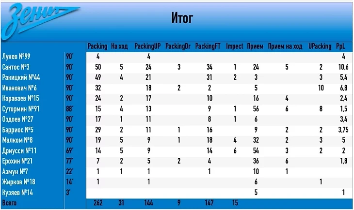 Packing – число игроков соперника, оставленное за линией мяча передачей. PackingUP – то же самое, под давлением. PackingDR – количество игроков соперника, оставленное за линией мяча дриблингом. PackingFT – packing в финальной трети. Impect – считаются только «отрезанные» защитники. На ход – packing на ход партнеру, после которого не замедляется атака (считается в количестве передач, а не отрезанных игроках). Прием – обратный packing, сумма игроков, «отрезанных» пасом у принимающего. Прием на ход — обратно «на ход», считается количество передач, принятых на ход