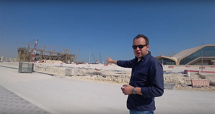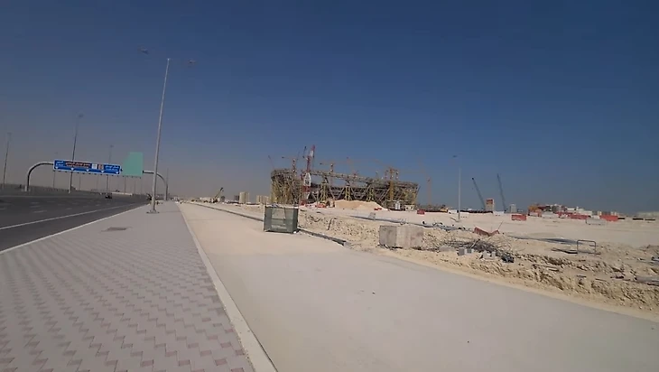 На стадионе «Лусаил». Он только строится и сейчас выглядит вот так. Рядом большой транспортный узел.