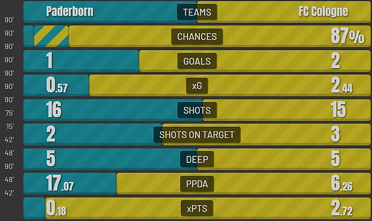 Любителям статистики также прилагаю фото с различными показателями, дающими почву для анализа. Здесь можно увидеть и низкое качество моментов, создаваемых "Падерборном", и тот самый класс "Кёльна", про который я говорил выше, и ещё много-много интересной информации.