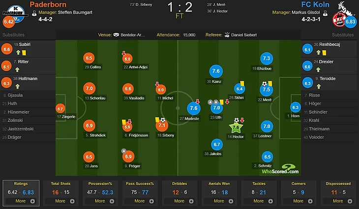 По прошествии почти получаса игры у "Кёльна" получилось провести очень неплохой отрезок, выраженный в длительной позиционной атаке, которая в итоге и завершилась голом. Идеальная игра в короткий пас в штрафной соперника - и "козлы" открывают счёт в матче точным ударом Хорхе Мерэ. Спустя всего 8 минут игры "Кёльн" подкрепляет промежуточный результат, удваивая счёт. В целом ничего не предвещавшая атака закончилось фантастическим по своей красоте ударом Хектора в дальний от вратаря угол. Во втором тайме "Кёльн" продолжал контролировать мяч, время от времени создавая, так скажем, "подходы" к воротам соперника. В финальную фазу игры "Падерборн" внезапно активизировался, перейдя из низкого блока в средний, а также начал активно применять высокий прессинг. Результат последовал довольно быстро: уже на 73-й минуте активность хозяев конвертируется в гол, и Србени сокращает отставание до минимума. В оставшиеся 15 минут матча "Падерборн" буквально "заковал" гостей в их штрафную площадь, создав тем самым несколько крайне опасных моментов. Однако до гола дело так и не дошло - тяжелейшая победа "Кёльна" на "Бенталер-Арене".