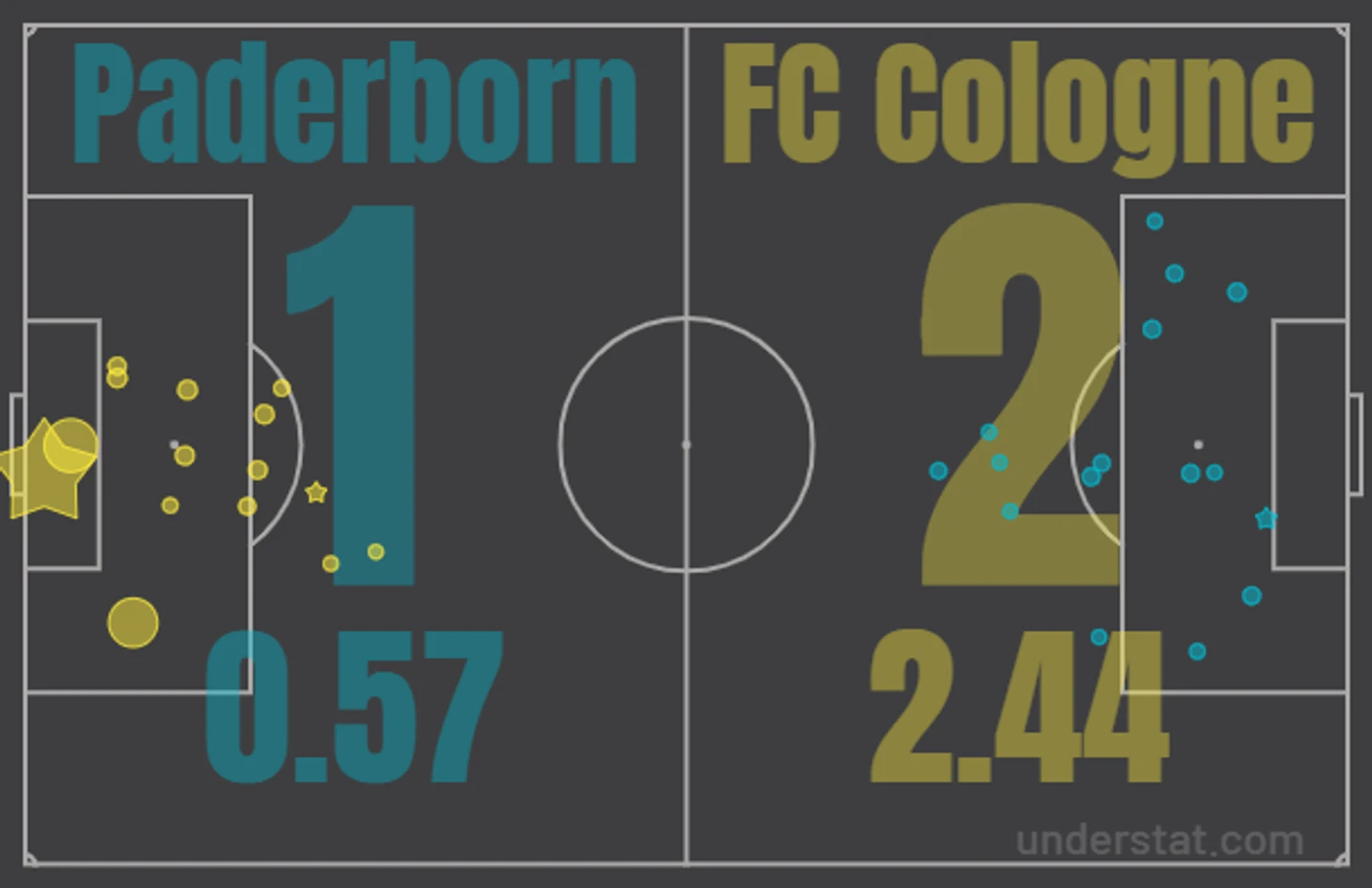 Пройдёмся по хронологии. Матч начался в довольно равной борьбе, с обоюдным переменным прессингом, да и в целом планы на игру у наставников были схожими. Модуль 4-2-Х сохранился у "Падерборна" и "Кёльна" на протяжении всего матча, что и дало повод к такому "качельному" футболу, где огромную роль играют опорники - бокс-ту-бокс, которые должны успешно продвигать мяч вперёд, отдавать точные передачи во время быстрых атак, а также при необходимости непосредственно подключаться к наступлению. Здесь, определённо, класс и мастеровитость футболистов "Кёльна" сделали своё дело. По замыслу идеи "Падерборна" были понятными: вероломные, резкие атаки с выходом на ударную позицию и незамедлительной угрозой воротам противника. Однако точность ударов нападающих хозяев явно оставляет желать лучшего: чаще всего у Тимо Хорна и близко не было никакой работы. Как итог, целых 16 ударов было нанесено в сторону ворот "Кёльна", из которых лишь 2 пришлись в створ.