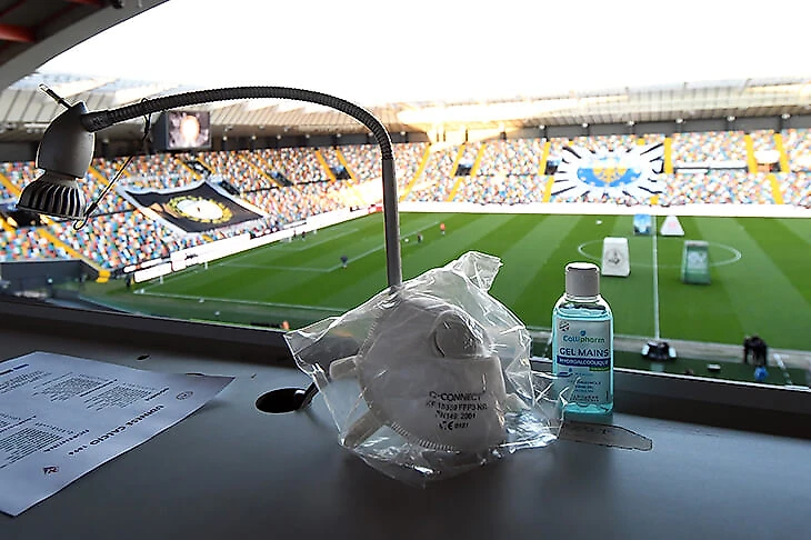 Градусники на входе, маски и санитайзер для рук – в пресс-ложе. Атмосфера топ-лиг во времена коронавируса.