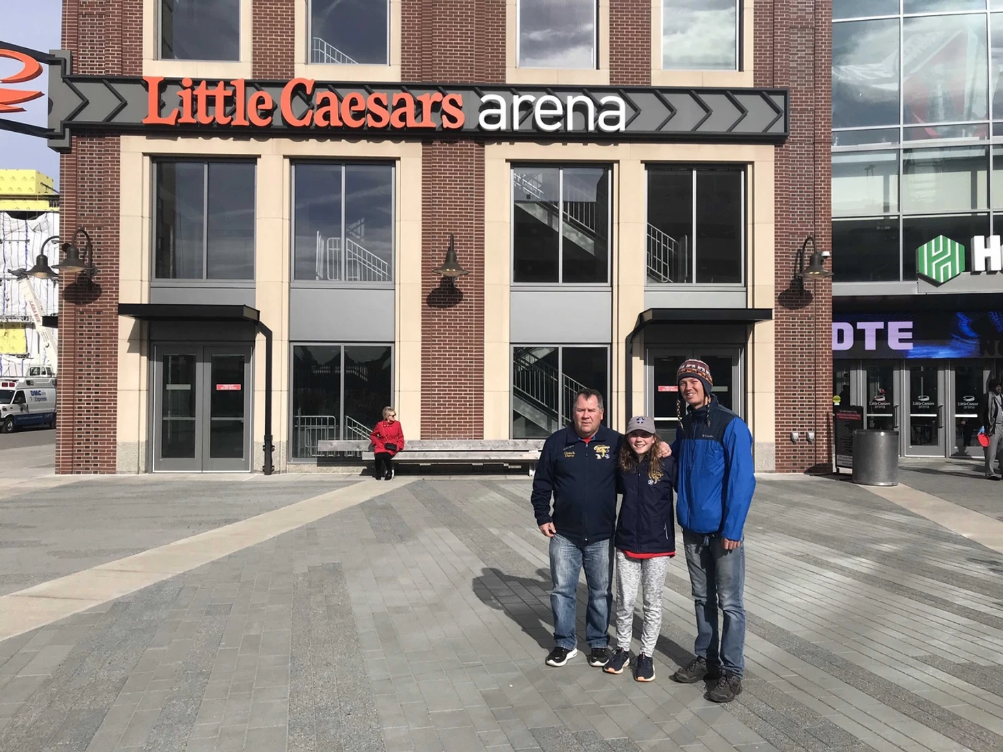 «Хоккейный город» – гласит вывеска, встречающая нас на «Little Ceasars Arena». Арена открыта в 2017 году, здесь свои домашние матчи проводят «Детройт Ред Уингз» и «Детройт Пистонс». Дэйв раньше часто ездил на игры, но на новом стадионе еще не бывал. Оказавшись внутри арены, он был впечатлен: «А здесь уютно!» Множество магазинов с атрибутикой, бары, рестораны. В один из них Дэйв сразу же зашел: купил себе пиво, а дочери крендель.