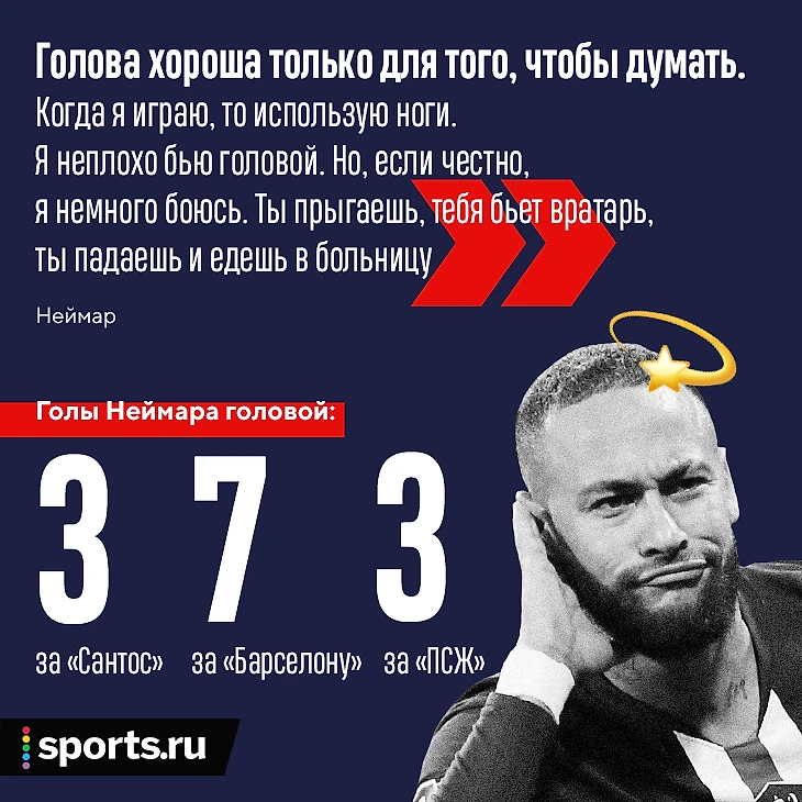 «Голова хороша только для того, чтобы думать, – сказал Неймар в интервью Otro. – Когда я играю, то использую ноги. Я неплохо бью головой. Даже хорошо. Я могу контролировать их [удары головой] и хорошо завершать эпизоды. Но, если честно, я немного боюсь.