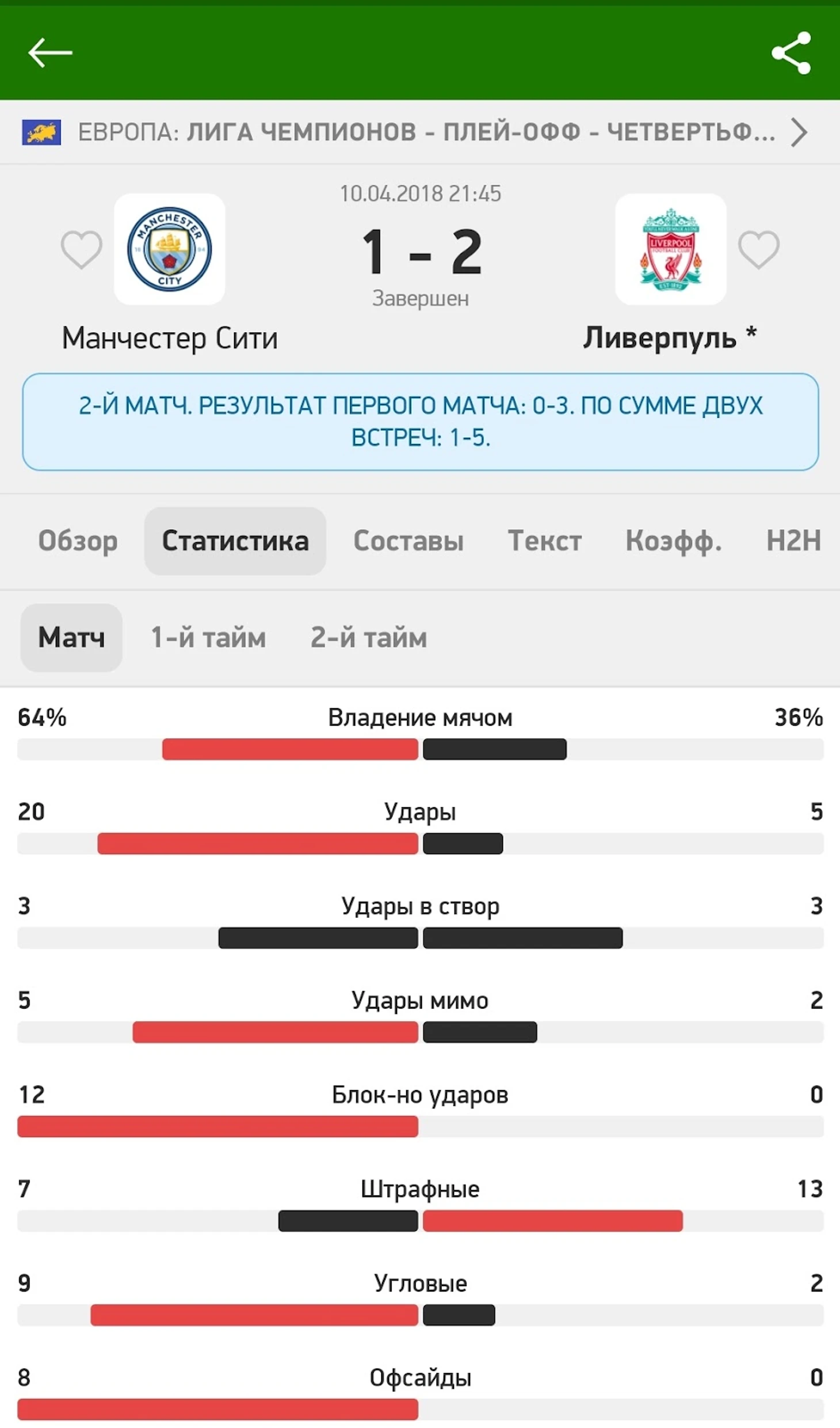 Что сделал Клопп в ответной встрече? Как следует припарковался! «Сити» быстро забил первый гол, однако даже после этого игра не раскрылась – «Ливерпуль» сидел очень глубоко. В конце тайма Сане забил чистый гол, который ошибочно отменил судья (позже об этом несколько раз вспоминал Гвардиола). 1-0 на табло, владением мячом : 66 – 34, удары : 13 – 2. Если кто не понял, это статистика по итогам первого тайма. Все цифры в пользу «Сити», разумеется.