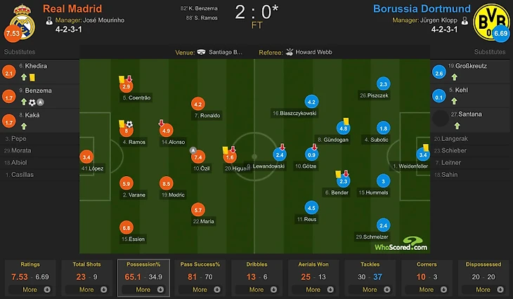 Смелым футболом в исполнении желто-чёрных на Бернабеу и не пахло. Даже несмотря на то, что команда Моуриньо не славилась умением или желанием долго контролировать мяч, по итогам 90 минут у «Реала» было 65% владения мячом. В заключительном отрезке игры сливочные забили 2 гола, немцы окопались в своей штрафной, однако дотерпели до конца матча и не пропустили в третий раз – путевка в финал была добыта.