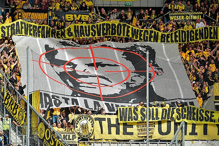 Фанаты «Боруссии» немедленно вступились за друзей, которых лишили денег и футбола: «Платить штрафы и пропускать матчи из-за песен и баннеров? Ты совсем охренел, Хопп?!» На ближайшем матче в Зинсхайме (22 сентября) они достали уже знакомый плакат с прицелом на ненавистном лице.