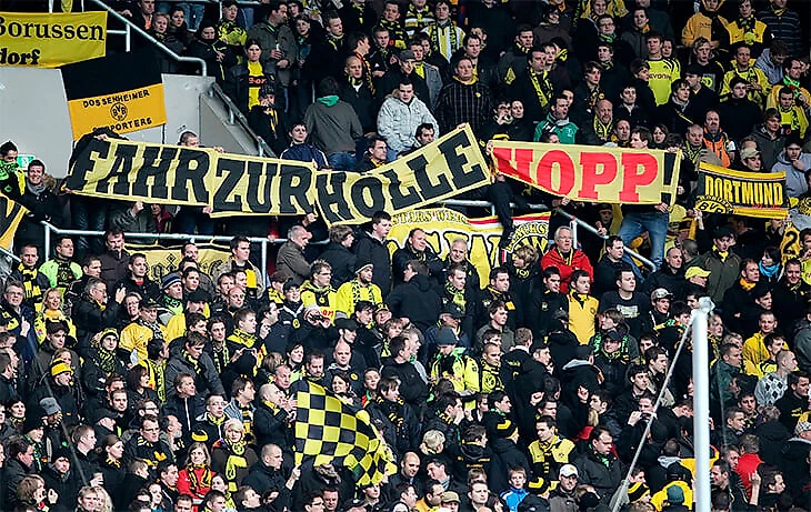 В конце декабря 2019-го «Хоффенхайм» играл дома с «Дортмундом». С гостевого сектора практически сразу понеслась жара: «Всех с наступающим Рождеством! Всех, кроме тебя, Хопп. Надеемся, для тебя оно станет последним», «Сын шлюхи», «Нам насрать на тебя».
