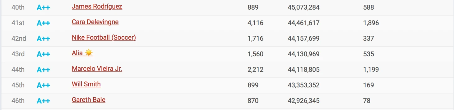 Чтобы это выяснить, лучше всего начать с инстаграма. В мире меньше 100 аккаунтов у которых есть больше 40 миллионов подписчиков, что значитель облегчает поиск. Ближе всего к 43 миллионам 4 игрока: Златан Ибрагимович (41,8 млн), Марсело (44 млн), Гарэт Бэйл (42,9 млн) и Хамес Родригес (45 млн).