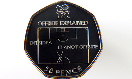 Дэвид Хиллс с удивлением смотрит на новую оффсайдную монету: «Новую монету с футбольной гравировкой, призванную облегчить понимание положения «вне игры», футбольные эксперты называют «устаревшей» и «сбивающей с толку». Футбольная монета показывает полузащитника, который собирается отдать пас одному из двух одноклубников, первый из которых, слева, находится в положении «вне игры», а второй, на одной линии с защитником, в правильном положении. Но гравировка показывает трактовку этого футбольного правила такой, какой она была до 1995-го года, когда ее пересмотрели, чтобы уменьшить количество остановок в игре. В соответствии с поправками, если полузащитник отдаст мяч игроку слева, и этот игрок решит не играть мяч, то в таком случае положения «вне игры» нет и игра продолжается».
