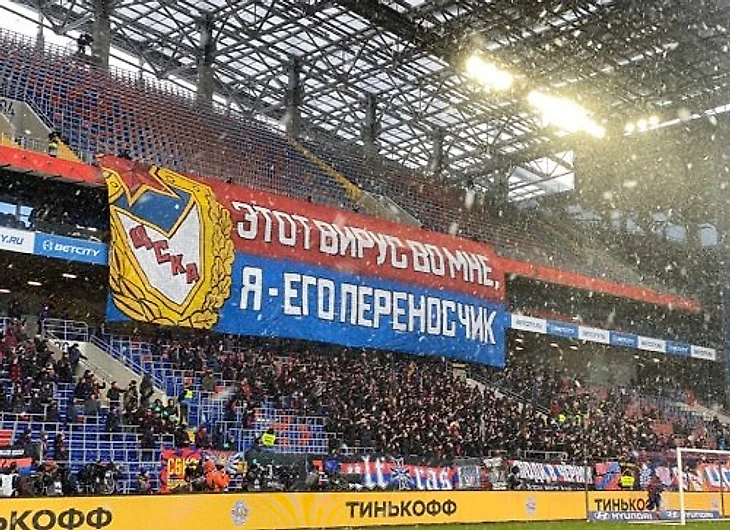 " (если она состоится в ближайшее время). Понятно, что все произошло не по вине ЦСКА, и клуб хотел выйти из трудной ситуации с меньшими потерями (репутационными, в том числе). Но как обладатель абонемента, заплативший деньги, довольствоваться встречей с "Уфой" и пропускать "Зенит" - это не очень справедливо. Еще одно странное решение клуб принял непостредственно перед встречей с "Уфой", отказавшись от контактов с прессой. То есть пускать болельщиков (пусть и не на все сектора) в условиях пандемии - это нормально, а выходить к прессе игрокам - нет? Л - логика. Судя по баннеру, болельщики ЦСКА пока не переживают по поводу коронавируса.