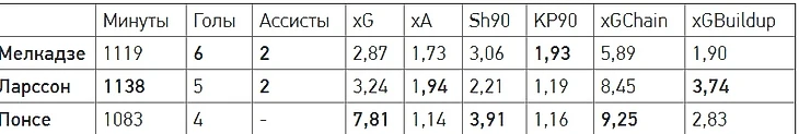 Теперь сравним атакующую статистику Мелкадзе с показателями форвардов красно-белых — Ларссона и Понсе.