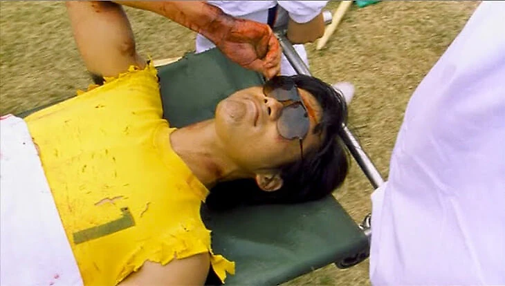 Ну и нельзя не вспомнить момент, когда героя Чана уносят с поля на носилках в самом конце фильма. В оригинальной версии «Убойного футбола» во время этого эпизода звучит фраза: «Ты только физически нас покидаешь, но твой дух останется с нами навсегда». Скорее всего, это еще один намек на легендарного актера, ведь сам Чан выглядит весьма брутально, лежа на носилках в солнцезащитных очках, и при этом страшно напоминает Брюса Ли.