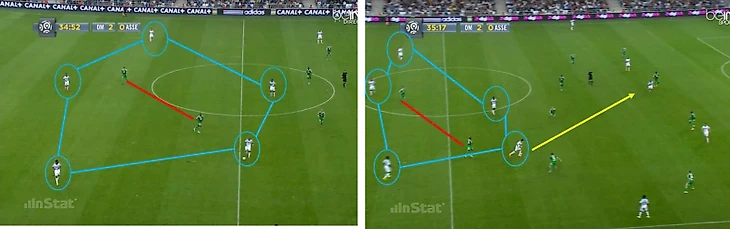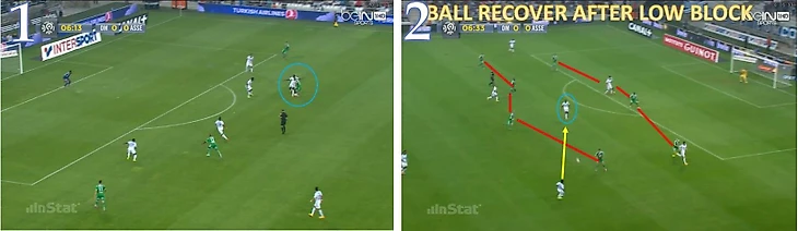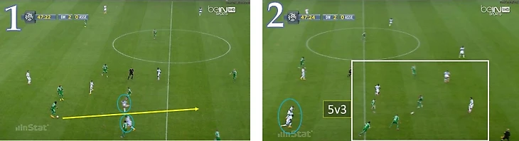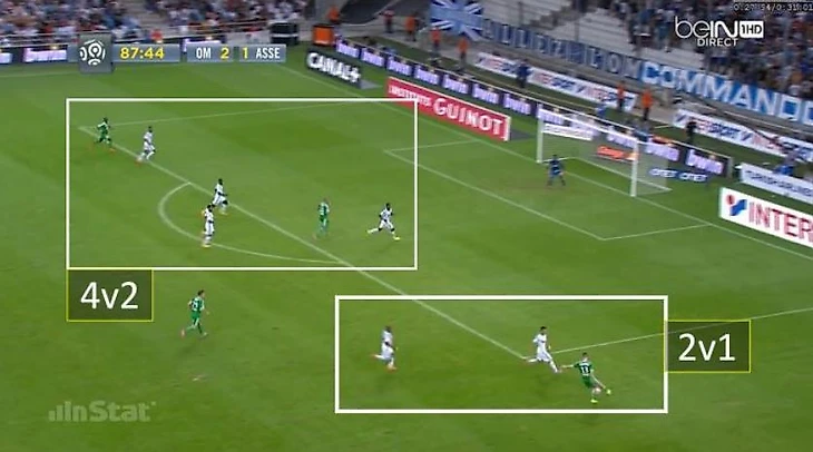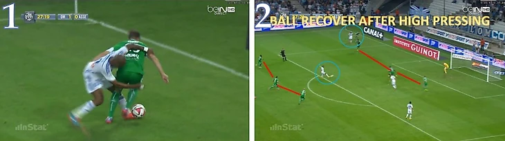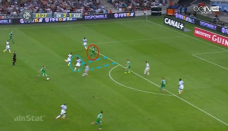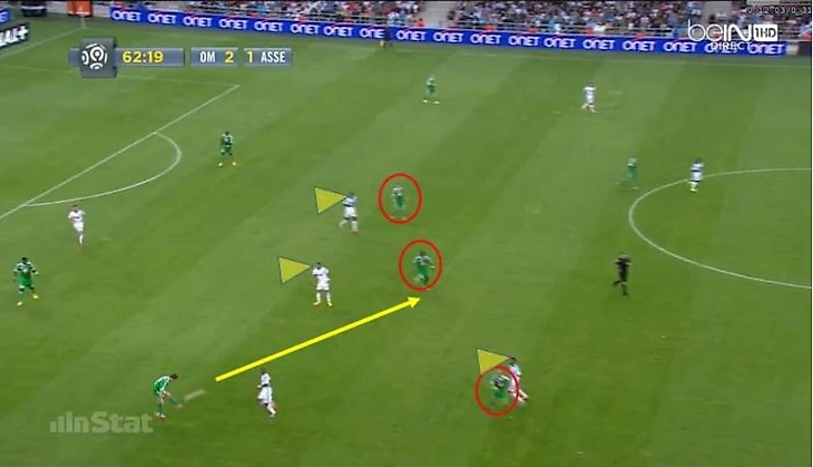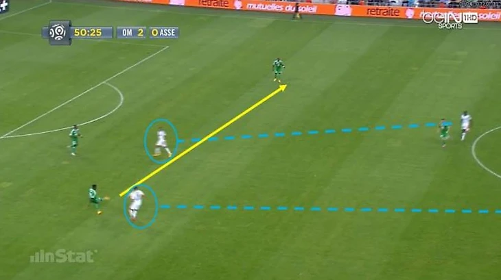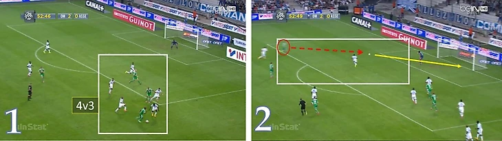 Второй тайм "Марсель" стартует не в лучшей расстановке при прессинге, а также без компактности. Много пространства во время высокого прессинга между линиями позволяло сопернику контролировать игру. Это привело к пропущенному голу.