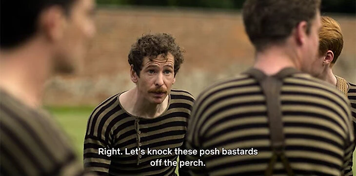 Классовая борьба вообще изображена довольно черно-бело. «Олд Итонианс» мощнее физически, играют в светлой форме для игры в крикет из очевидно куда лучшего материала, чем потертые треники и подтяжки рабочей команды. После матчей аристократы собираются за большим столом в смокингах, работяги – в пабе на деревне. Если в кадре вы носите котелок или не дай бог цилиндр, вероятнее всего вы окажетесь невероятным мерзавцем, а вот плоская кепка – символ рабочего класса – должна пробивать зрителя на максимальное сочувствие вашей тяжелой судьбе.