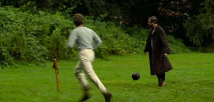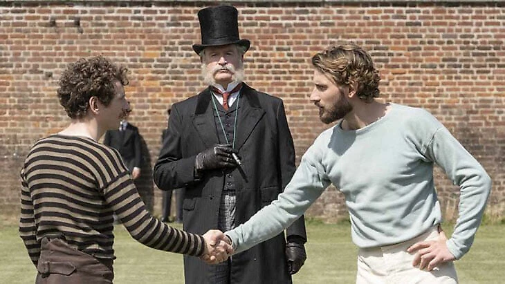 Что касается самого футбола, то спортивные фильмы всегда с трудом показывают реальную игру. Здесь же в реалиях 19 века для красочности кадра затерялся финт Зидана, но в целом на поле актеры выглядят так, будто играют договорняк. Просто посмотрите на прекрасную игру вратаря в этом моменте (вратарь справа в халате – иначе как вы поймете, что это максимально самовлюбленный товарищ?).