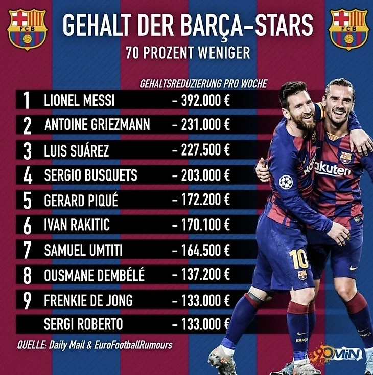Однако, изначально некоторые «сине-гранатовые» не были готовы расстаться с такой солидной частью зарплаты и их можно понять. Только посмотрите, сколько игроки «Барсы» будут терять каждую неделю в связи с сокращением зарплаты.