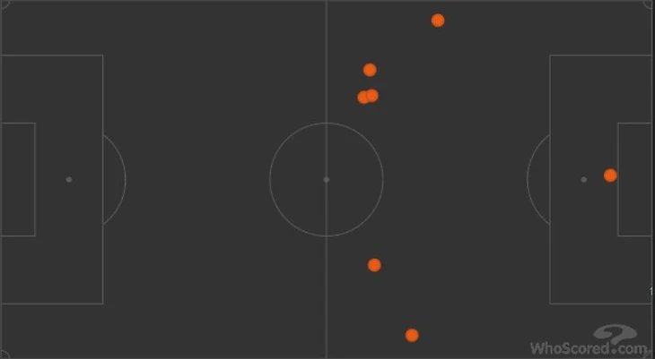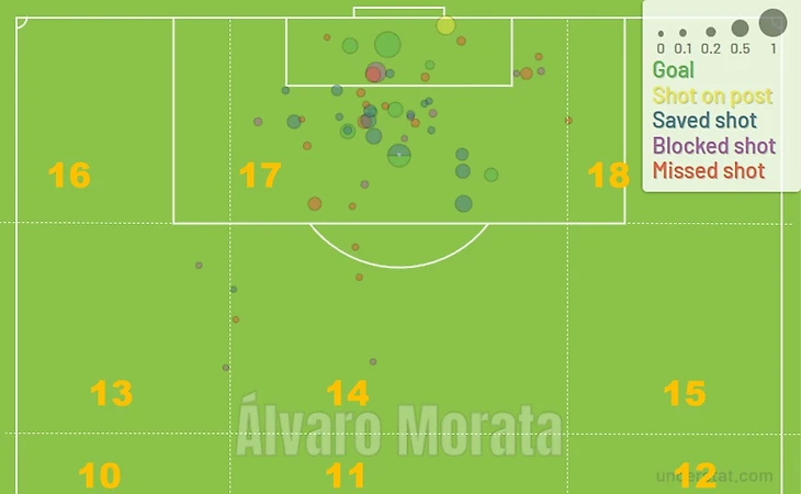 Справедливости ради, сложности с завершением у Мораты были почти всегда – лишь два сезона, начиная с 14/15, когда он забивал больше, чем набирал xG. Но этот случай действительно выделяется: худшая реализация с момента начала сбора данных при солидном игровом времени – сыграл больше только в «Челси» 17/18, но это только после 27 туров в нынешнем сезоне. Карта ударов Мораты в этом сезоне