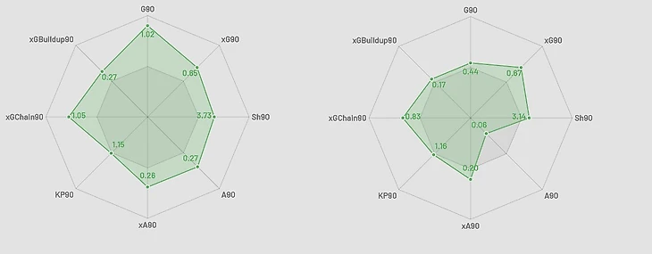 Давайте сравним реализацию Мораты этого сезона с самым удачным по забитым голам сезоном 2016/17. Слева – Мората 16/17, справа – 19/20