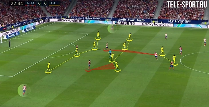 Другой важный момент – узкое расположение полузащиты «Хетафе»: перекрыт вариант передачи на Лемара или Феликса. Получается, что Жоао держит и полузащита, и защитник – идея «освободить опорную зону для Феликса» провалилась.
