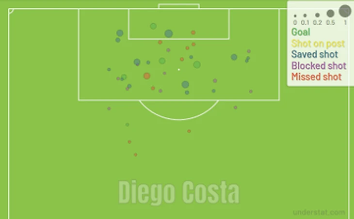 Все удары Диего Косты в сезонах 2017/18 и 2018/19