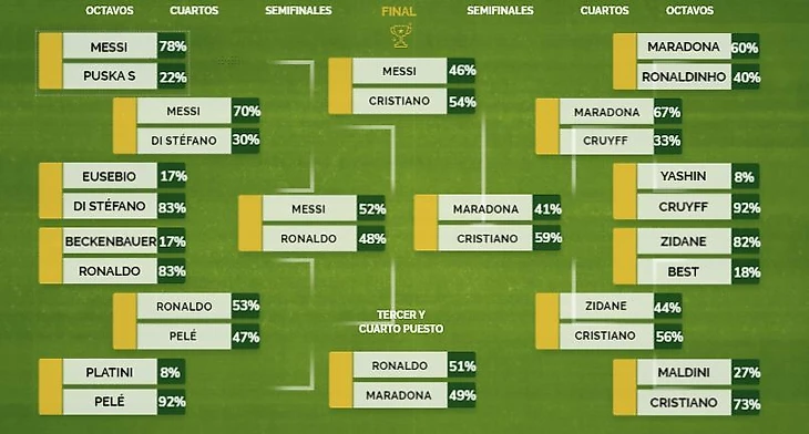 Издание Marca опубликовало поэтапное голосование, в котором предложило выбрать своим читателям лучшего футболиста в истории футбола.