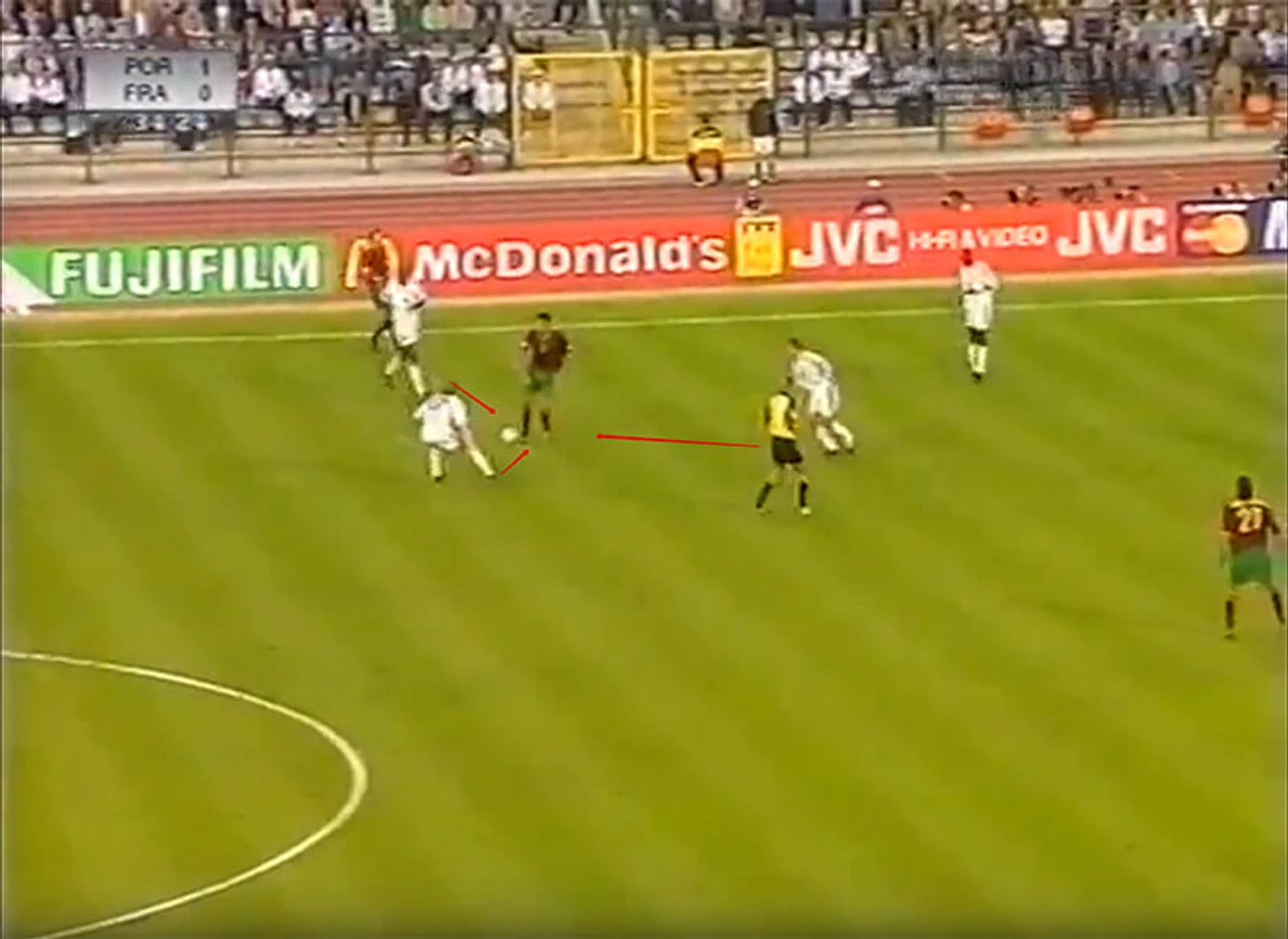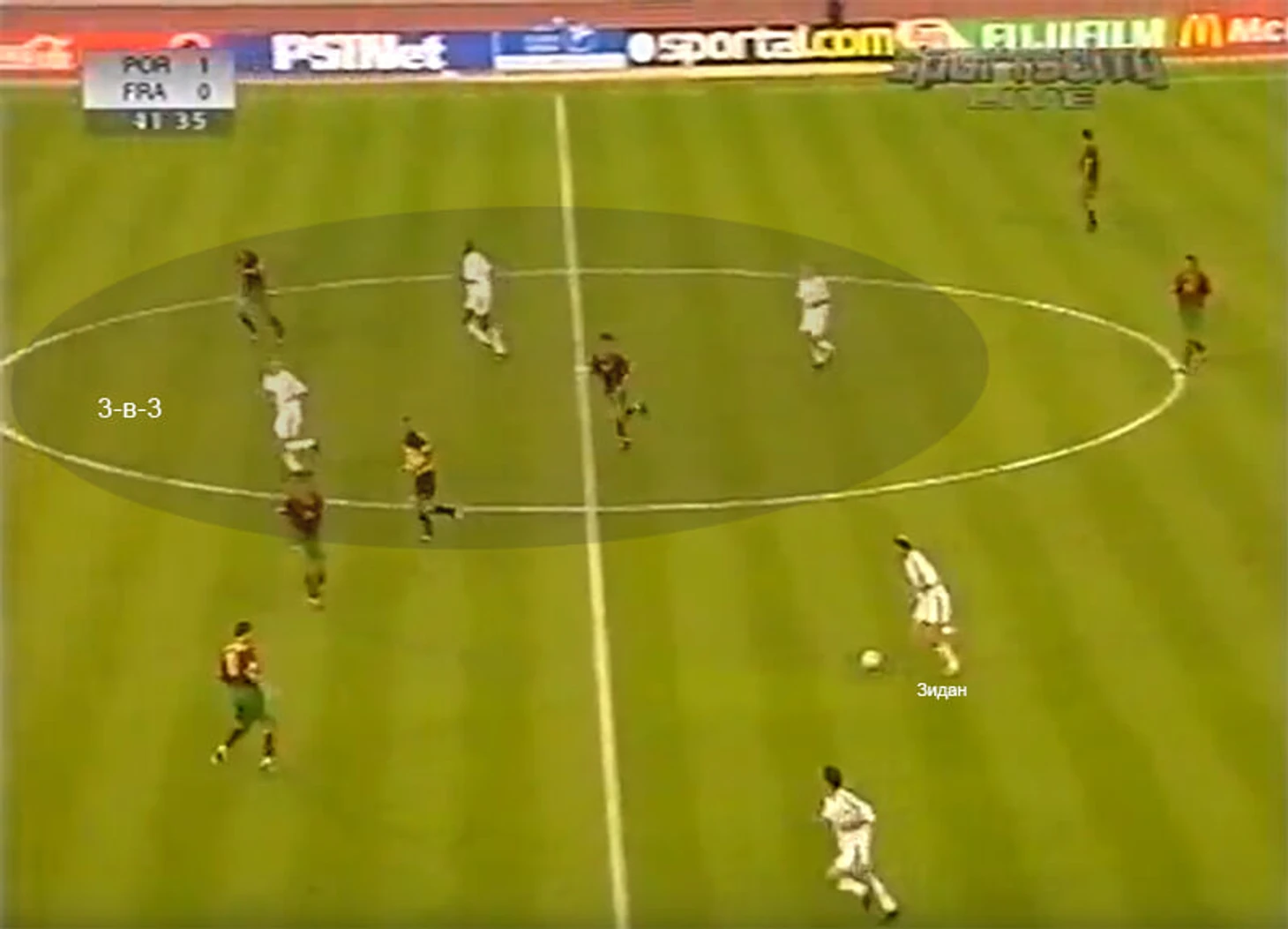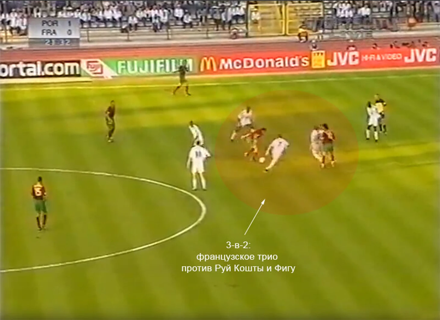 Иногда ситуация превращалась в 3-в-2 (Фигу и Руй Кошта против французов). Но Франция все равно сохраняла преимущество:
