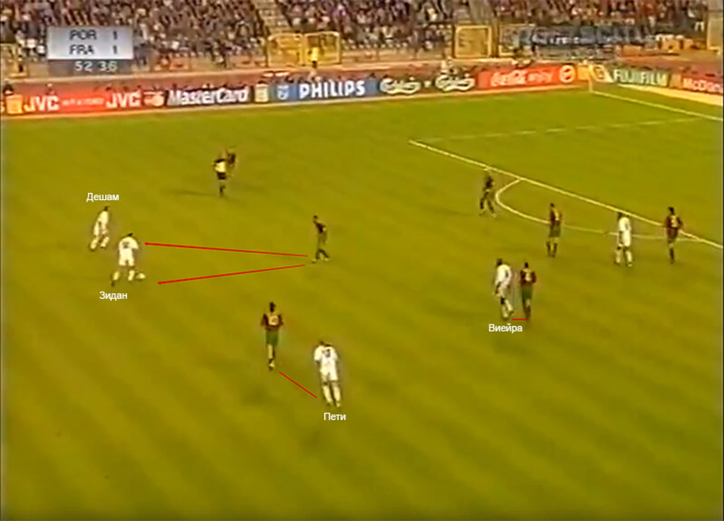 Логичным для Луиша решением был поиск зон в центре. Обычно взаимодействий с Руй Коштой хватало, чтобы показывать яркую игру и разрывать соперников. Даже если у противника было два явных опорника. С Францией Фигу тоже попытался провернуть этот трюк, но план Лемера предполагал не просто насыщение полузащиты, а тройку первоклассных разрушителей – Виейра, Дешам, Пети. То есть важным был не сам ромб в полузащите, а его наполнение.