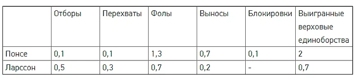 Ларссон лучше действует на пространстве, о чем свидетельствует статистика по отборам и перехватам. Понсе — непосредственно в своей штрафной площади при «стандартах». Аргентинец чаще фолит — и иногда грубо. Однако выигрывает много верховых единоборств, что помогает как при оборонительных действиях, так и в атаке.