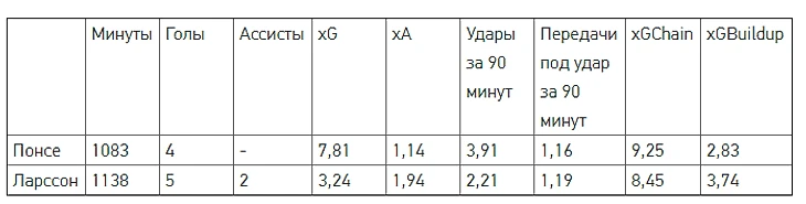 При этом Понсе вносит больший вклад в завершающую стадию атаки — у него выше показатель xGChain, учитывающий удары и передачи под удар. Ларссон — в начальную: швед превосходит одноклубника по статистике xGBuildup.