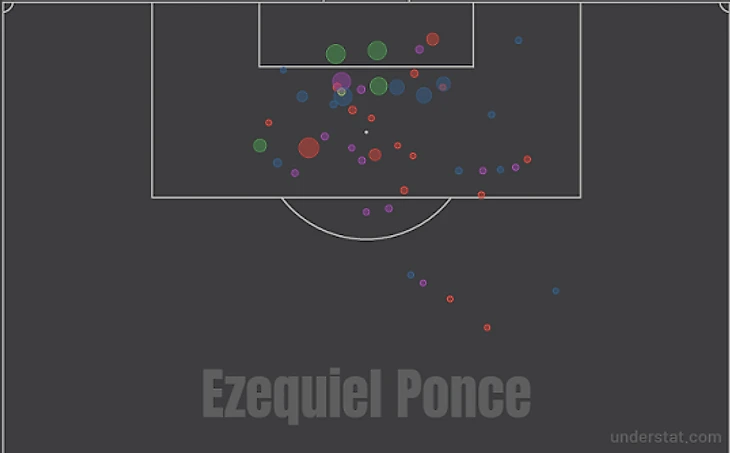 Оба форварда провели на поле примерно одинаковое время. Обратите внимание на статистику ожидаемых голов xG и ее соотношение с реальными забитыми мячами. Очевидно, Ларссон лучше реализует моменты. А вот Понсе мог бы отличиться почти 8 раз, однако он часто бьет мимо (красные круги на карте) или так, что удар блокируют (фиолетовые круги):