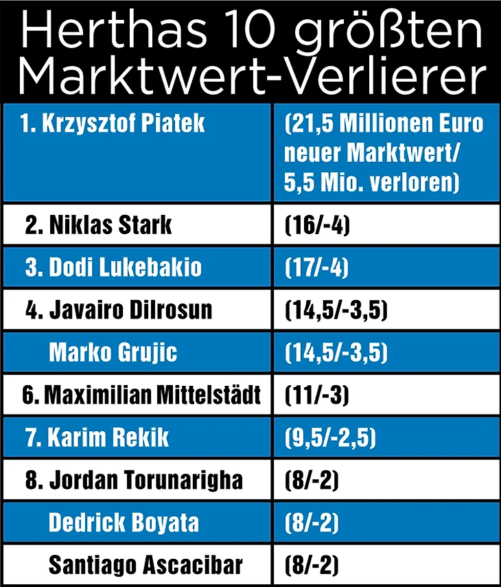 transfermarkt.de обновил данные об игроках. В частности у берлинского клуба произошло серьезное падение. Теперь суммарно игроки клуба оцениваются в 187,6 млн. евро, что на 40,1 млн меньше предыдущего значения.
