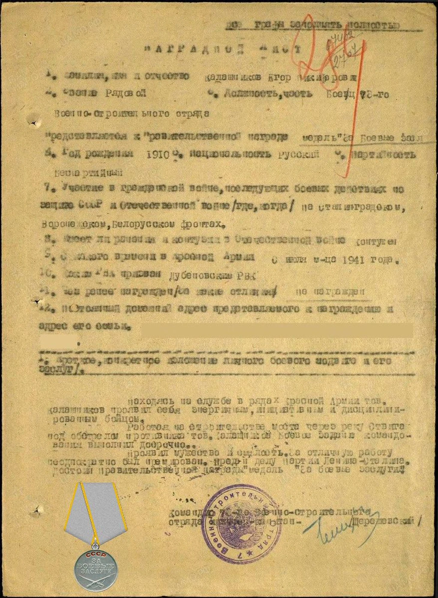 Прапрадед Кокорина служил в военно-строительном отряде. Медаль «За боевые заслуги» он получил за возведение моста через реку Ствига (территория Украины). Вот, что написано в наградном листе: «Работая на строительстве моста под обстрелом противников, товарищ Калашников боевое задание командования выполнил досрочно».