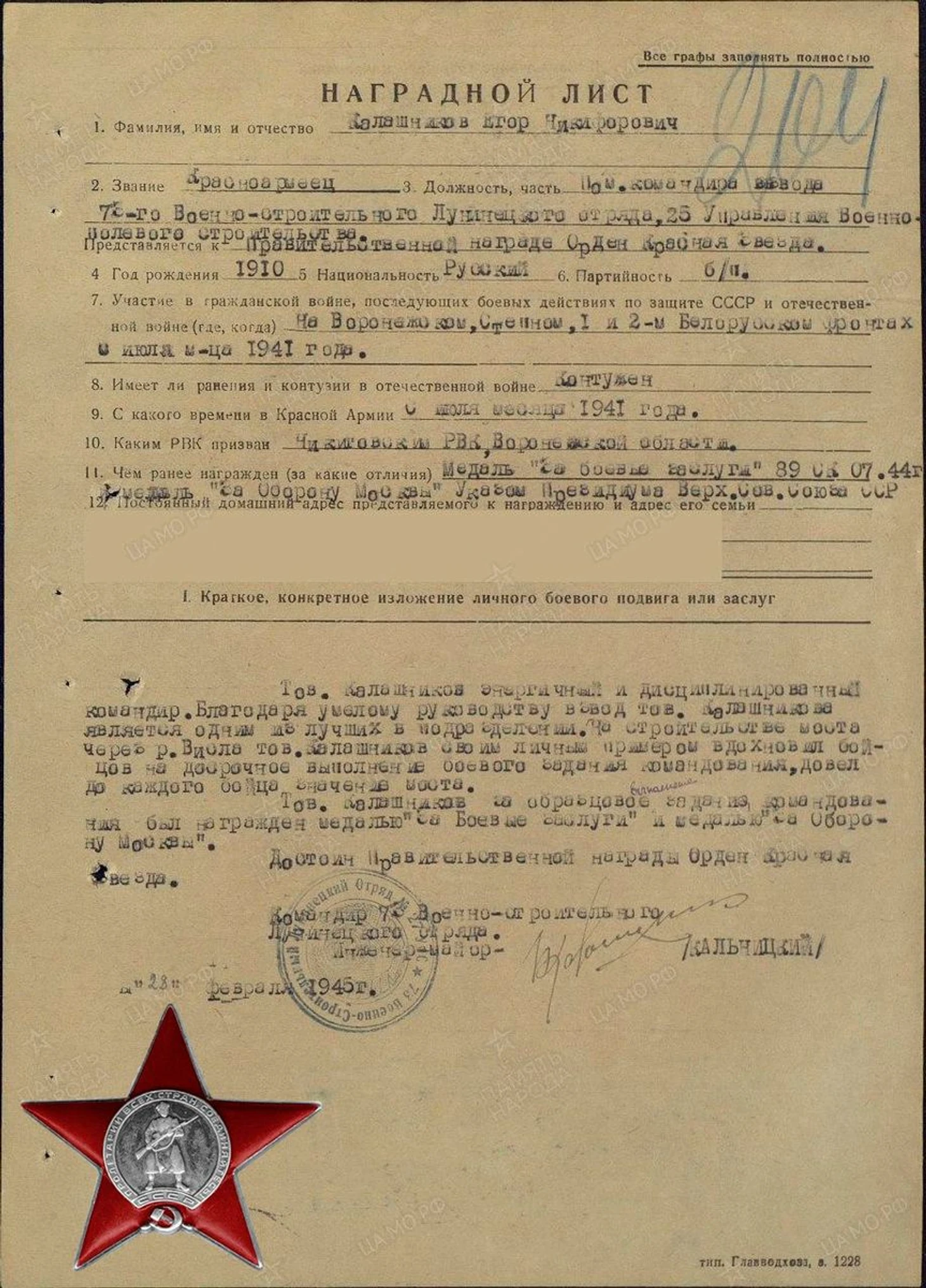 «Энергичный и дисциплинированный командир. Благодаря умелому руководству взводом товарищ Калашников является одним из лучших в подразделении. На строительстве моста через реку Висла товарищ Калашников своим личным примером вдохновил бойцов на досрочное выполнение боевого задания командования, довел до каждого бойца значение моста», – говорится в наградном листе.