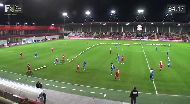 Лойпольц находится в треугольнике между соперниками. Она принимает пас от защитника, оказываясь под давлением с трёх сторон, но не суетится, а играет накоротке с другим партнёром, который, в свою очередь, сразу отдаёт пас на фланг: