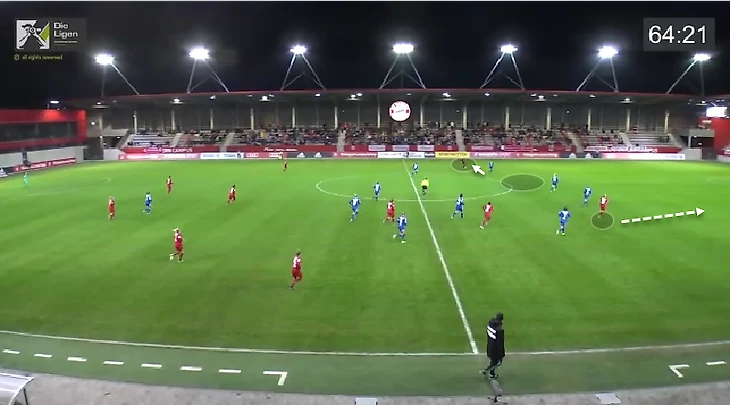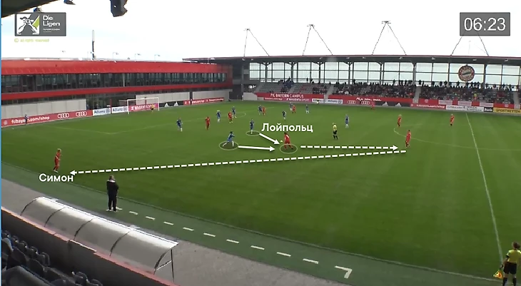 В этом эпизоде «Бавария» вводит мяч из аута. Лойпольц выигрывает борьбу и отправляется на свободное пространство. Она замечает свободного партнёра на противоположном фланге и переводит мяч туда: