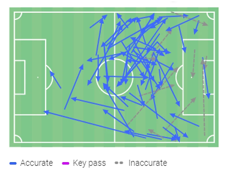 Карта передач в одной из последних игр с «Зандом» показывает, насколько важной частью команды является Лойпольц, и как она контролирует игру. Здесь есть и короткие розыгрыши в центре, и передачи по флангу, и переводы мяча с центра во фланг и обратно: