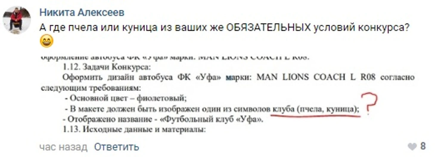В-пятых, в комментариях к новости болельщик Никита Алексеев логично спрашивает о несоблюдении победителем правил конкурса. В дизайне автобуса должны были присутствовать пчела или куница. В победившем дизайне их нет. Как так?