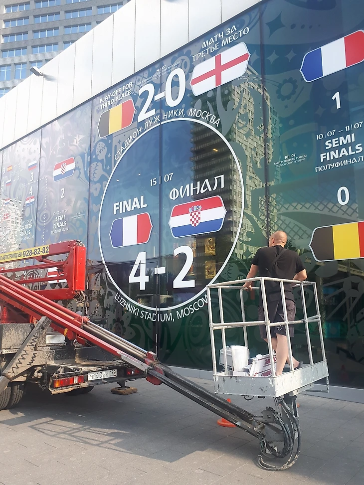 И вот день после финала. 16 июня 2018 года. Понедельник. Я приезжаю на Новый Арбат. Вижу, как на стеклянном фасаде здания появился счёт финала. Рядом со всем этим - мужчина, который всё это, видимо, приклеивал. Машина ещё не уехала.